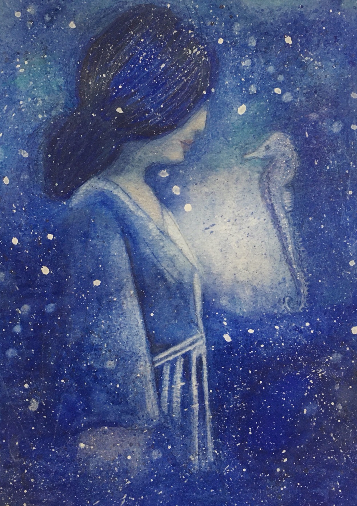 Mixed Media art made with classic watercolor techniques, color pencils, soft pastels and a hint of acrylics. It's a monochromatic color scheme but this painting took many weeks to finish! Handmade with love and lots of patience.