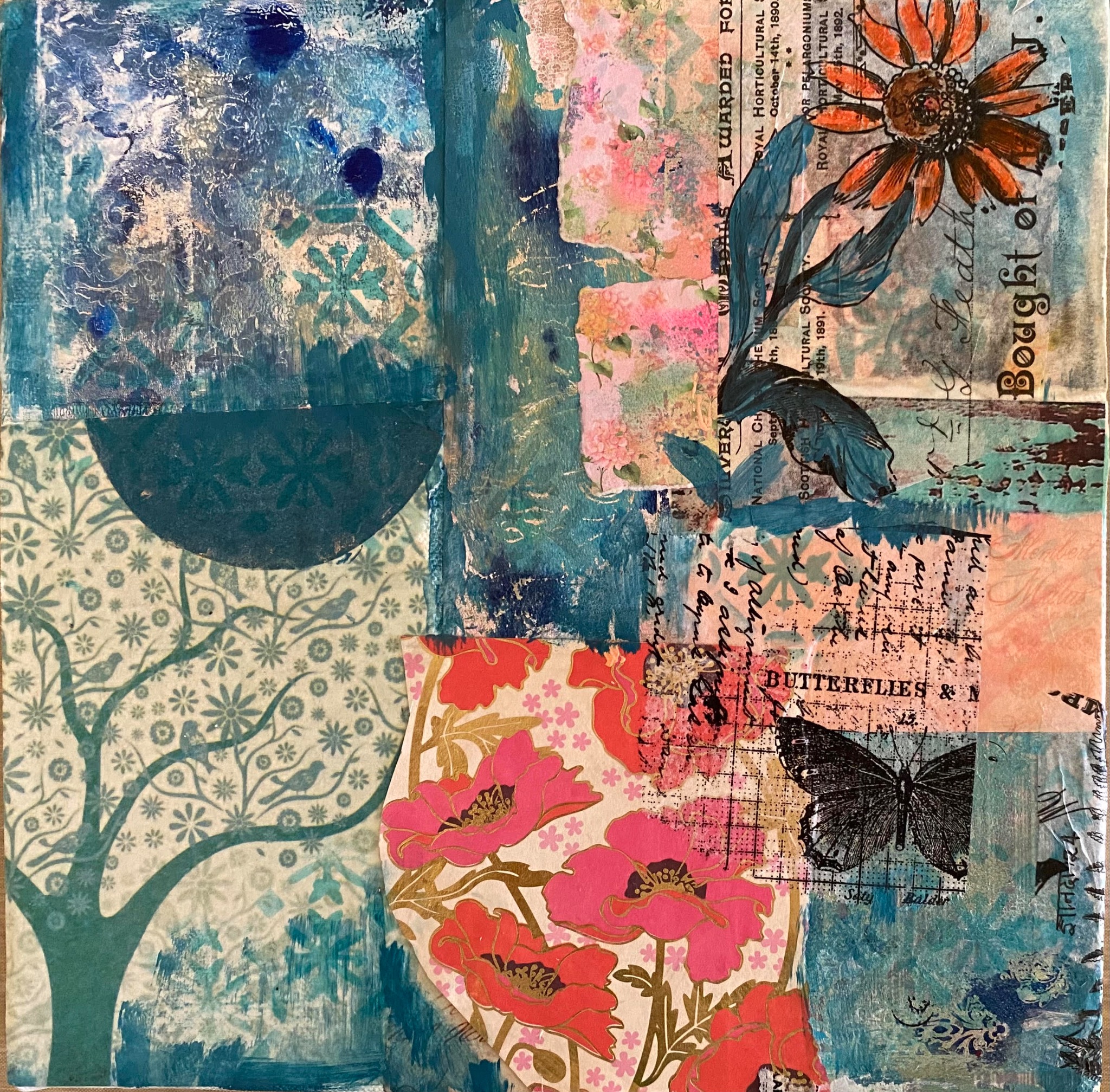 Acrylics and collage in my favourite colors blue green and pink, peach and orange for a splash of joy! This is one of my fastest creations made overnight.