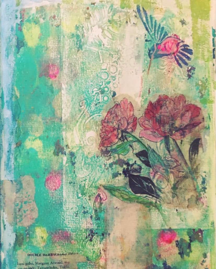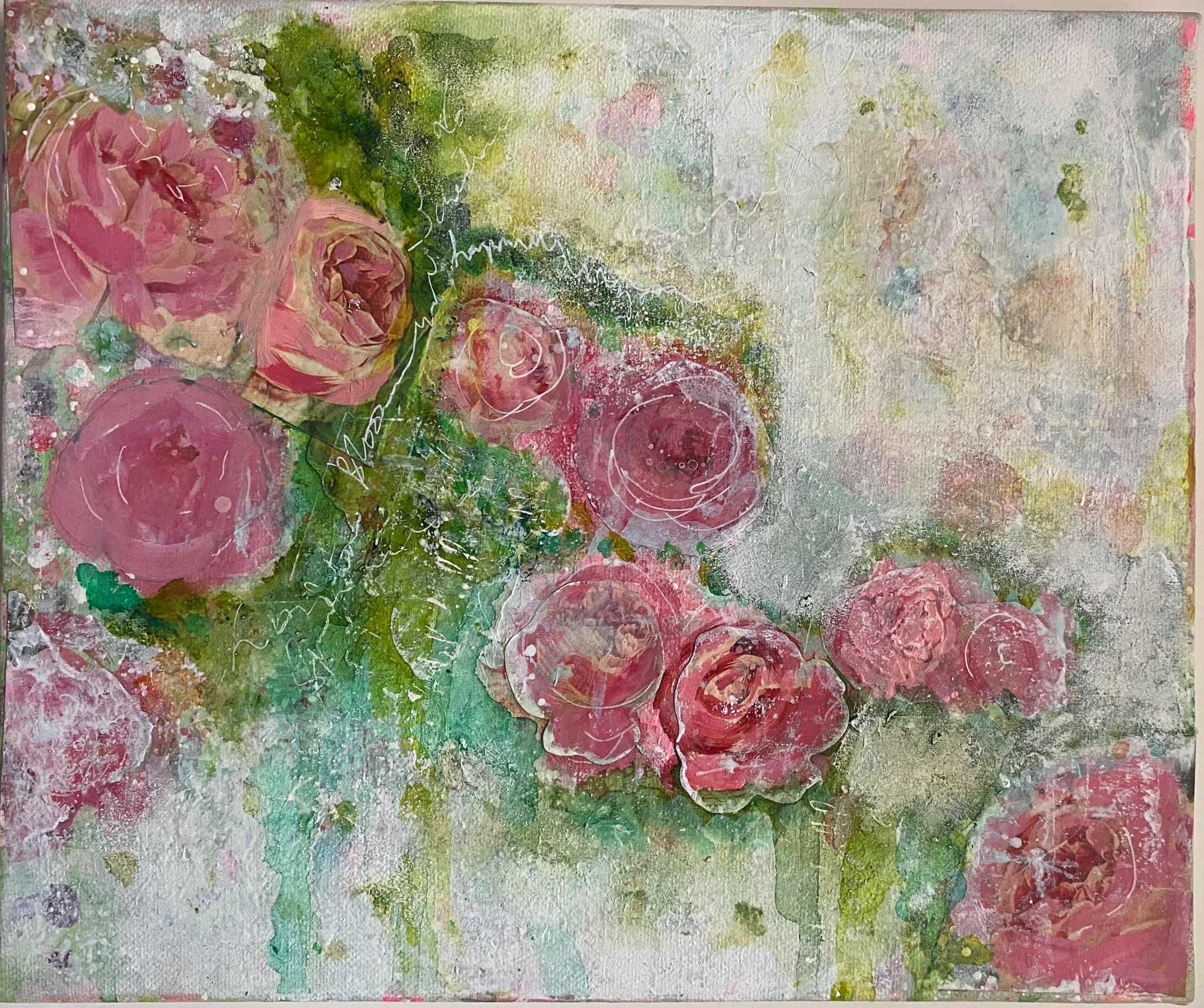 Mixed Media roses with acrylics, soft pastels, alcohol inks and collage. This painting was infused with good vibes and special ingredients. It has taken the longest time to complete. And is a Limited Edition creation, already sold.